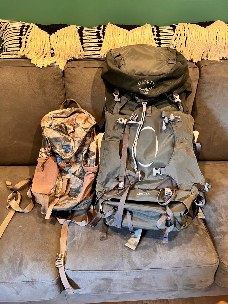 Another bit of fun news is that I got a backpack this last weekend! I have been researching different beginner packs and had my eye on the REI Flash 55. Since I am just a beginner at backpacking, I wanted to get something that fit comfortably, wasn’t too heavy, and didn’t cost a million dollars. Last Sunday, we went to the REI ReSupply store and tried on several packs. I finally landed on the Osprey Ariel 55. It’s a bit heavier than I wanted (4.8 lbs), but since I’m just doing a night or two at first, this will work fine. And for the price of $89, it was absolutely perfect. Now I have 2 packs: my Flash 22 for day hiking and my Ariel 55 for my overnights!