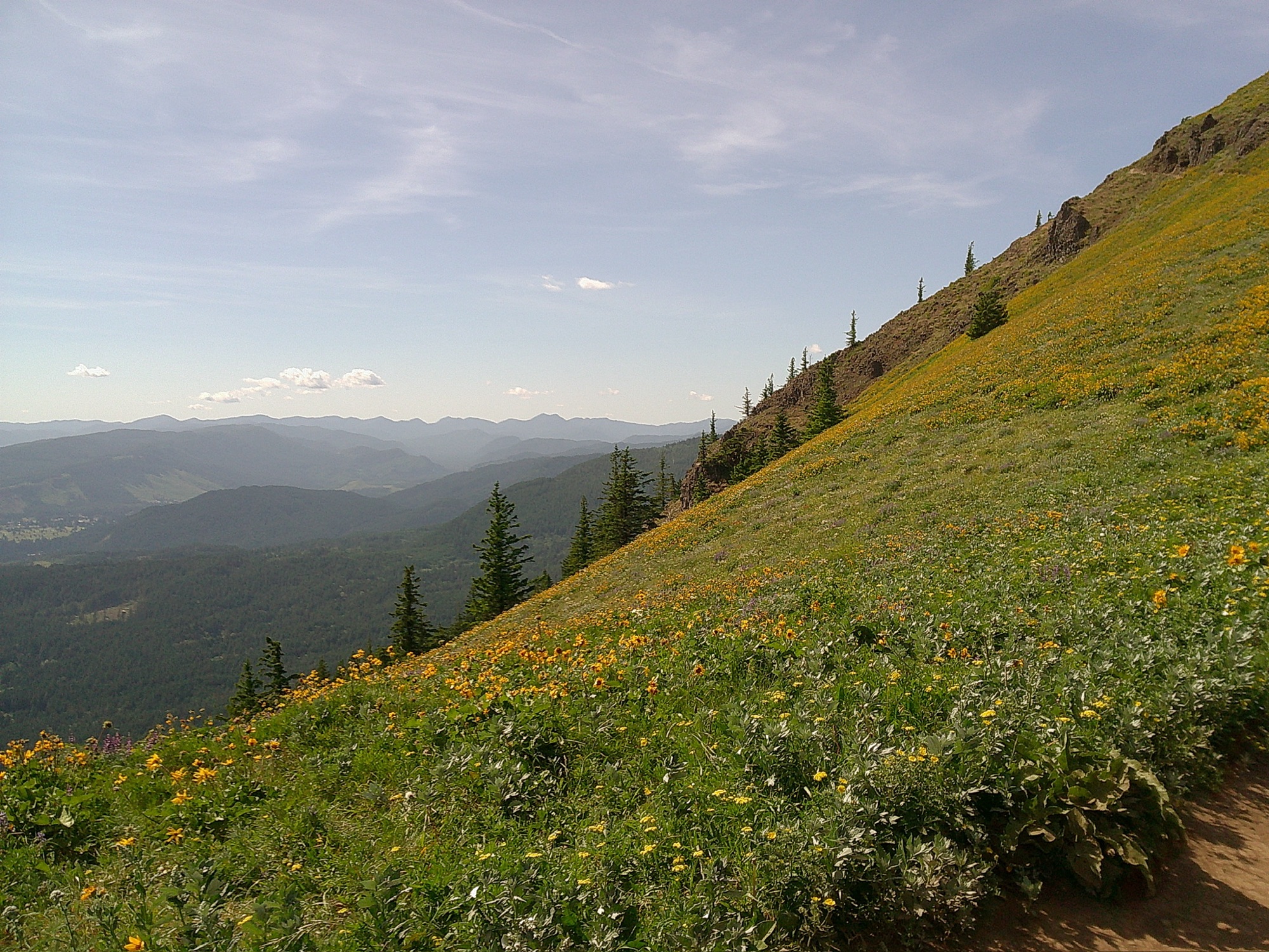 We continued to climb, stopping every few minutes to catch our breath and stretch a bit. Everything felt tight. We were passed by several people who looked perfectly chill climbing up the mountain, smiling and seemingly dry from any sweat. WTF!? But we didn’t give up, even though we wanted to. After a while, there was a break in the trees, and we emerged to sunshine and an opening that overlooked the gorge and gave us the first view of the wildflowers. WOW. What a sight! The yellow flowers peppering the mountainside were blowing in the breeze, and the gorge down below looked so blue/green with little twinkles scattered on the surface. We weren’t near the top yet, but it fueled us with the energy to keep going. If this was just a peek, I couldn’t wait to see what it looked like when we reached the top.